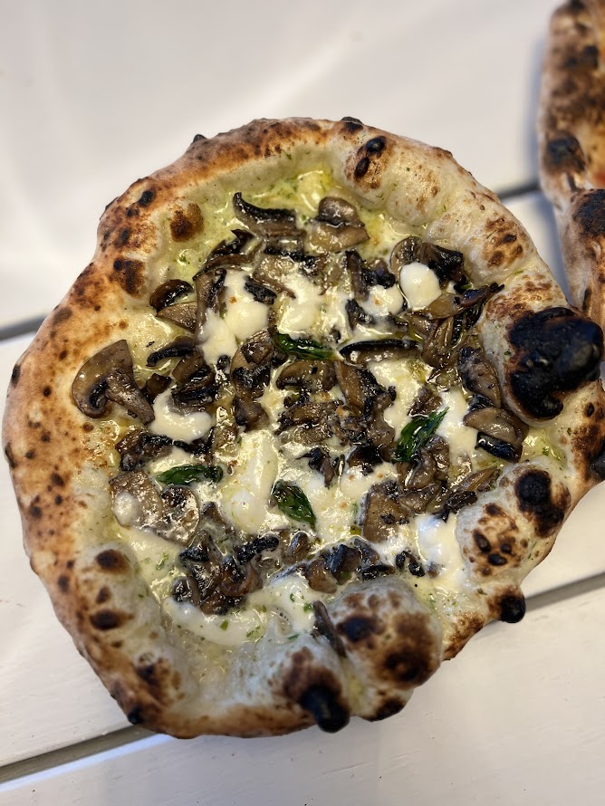 Syrad grädde, Fior di latte, parmesan, pecorino, svamp, vitlök och tryffelolja (vit)
